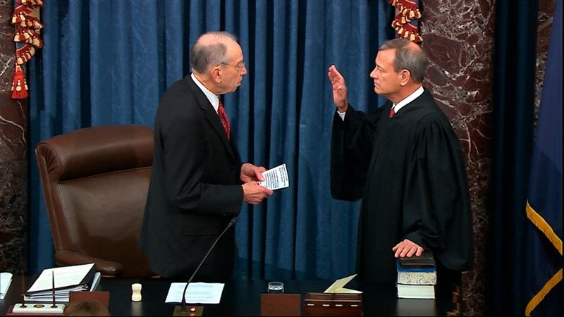 周四,最高法院首席大法官约翰·罗伯茨在参议院宣誓将根据宪法和法律在此次弹劾审判中公正执法。媒体分析,当下周二审判正式开始时,他将发现自己置身于一场高度紧张的政治斗争之中。 周四最高法院首席大法官约翰·罗伯茨在参议院宣誓 美联社 宪法赋予参议院“审理所有弹劾案的唯一权力”,并赋予最高法院首席法官在总统受审时担任审判长的职责。但宪法对审判的实际过程只字未提,这让人不禁要问,这位64岁的法学家是会在监督审判的过程中扮演主要的礼仪性角色,还是会被卷入政治斗争,被迫做出相应的决定。 法律专家说,罗伯茨希望仿效已故首席大法官威廉·伦奎斯特。伦奎斯特在1999年对克林顿总统的审判中基本上不干涉的做法。伦奎斯特曾打趣说,在诉讼过程中,他“什么都没做,但做得很好”,让参议员们自己规划自己的路线。 首席大法官长期以来一直担心联邦法官会被政治化,并试图保护最高法院的声誉不受党派政治的影响。 对于克林顿的审判,参议员们一致通过了一项决议,为程序的早期阶段设定了规则,但目前的参议院领导人已经在如何推进的问题上陷入僵局数周。 如果双方无法就传唤证人作证的问题达成协议,罗伯茨可能会更深地卷入这场争论。 周五,知情人士称,美国总统唐纳德·川普计划在其弹劾法律辩护团队中增加三名经验丰富的律师,其中包括强硬的前检察官肯尼斯·斯塔尔(Kenneth Starr),他的调查工作导致了比尔·克林顿总统遭到弹劾。宪法律师艾伦•德肖维茨和斯塔尔在克林顿政府时期的独立检察官办公室的继任者罗伯特•雷(Robert Ray)也将加入这个团队。 斯塔尔和德肖维茨将不会担任总统的首席辩护律师,这一职位将留给白宫律师帕特·塞波隆尼和川普的私人律师杰伊·塞库洛。白宫法律顾问办公室副主任帕特里克·菲尔宾和迈克·博普拉也将协助总统的辩护。前佛罗里达州总检察长帕姆·邦迪(Pam Bondi)正在为总统负责与弹劾有关的沟通工作,他也将代表总统进行部分口头陈述。