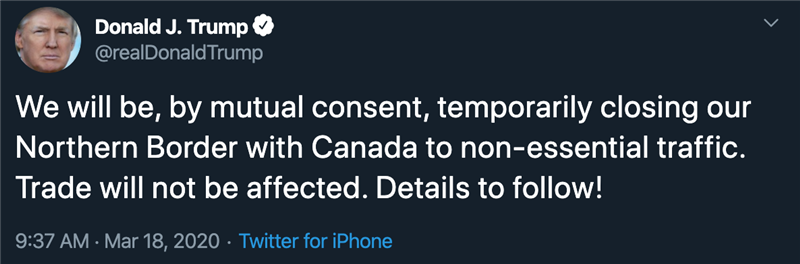 (美联社) 川普周三在推特上宣布,关闭美国和加拿大两国边境,以禁止双方“非必要的”交通,但贸易往来除外。 川普在推特上说:“经双方同意,我们将暂时关闭与加拿大接壤的北部边境,禁止非必要的交通,贸易不会受到影响,更多信息将稍后公布。”