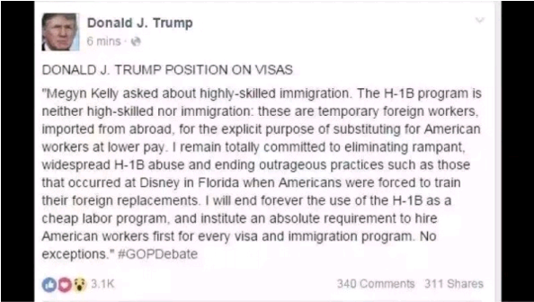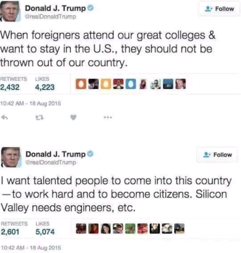 但是却忽略了这个图阐述的背景:“2015年10月,位于佛罗里达州的迪士尼乐园解雇了250名美国籍的IT部门员工,而这些人在离职之前,必须为他们的继任者——多为持H1b工作签证的印度人提供职业培训。2016年1月,两名被解雇的前迪士尼员工在法庭起诉了老东家及印度外包公司,指责后者违反了H1b签证相关规定。他们的核心论点是,雇佣外国员工不应该以伤害美国人就业为代价。” 要知道,H类签证本身制定的初衷就是不能伤害美国本土人就业,而是在本土找不到合适人才,雇主需要新人才的情况下吸引外国人才进行工作的项目啊!迪斯尼的行为本身就是对H类签证设定初衷的违反。如果对此有疑问,劳工部网站在此 https://www.dol.gov/whd/immigration/h1b.htm 我们明说 “The intent of the H-1B provisions is to help employers who cannot otherwise obtain needed business skills and abilities from the U.S. workforce by authorizing the temporary employment of qualified individuals who are not otherwise authorized to work in the United States.” 现在读者明白上面的意思了么? 来跟我读一遍:(这些)参与H1b项目的人既不是高技术人才也不是移民。他们是外国来的临时工,被招来的唯一目的就是以更低廉的薪酬水平取代美国人。我,唐纳德·川普,全心全意致力于消除针对H1b项目肆无忌惮的滥用,我会防止佛罗里达州迪士尼员工的悲剧再次重现,他们居然被迫去培训取代自己的外国备胎。针对所有的工作签证和移民项目,我都会提出绝对要求:先雇美国人。 川普有任何错误么? 作为H类签证执法人员最常见的情况包括但不限于: 1。资质不符或伪造资质。 2。工资不按合同支付,回扣,虚报情况严重。 3。重复申请,还没萝卜就去占好几个坑,然后上下其手,收取暴利。 4。申请人根本没在美国国内,公示手续弄虚作假。。。 而且这些情况不止在H类签证里有,J类也照样有,小O就从更资深的探员那里听过哥伦布的案子,而且受害者是日本的访学,名义上是过来交流日语,结果被集体塞过去打奴隶工,最后被劳工部解救。 相信我,我们执法人员都看得到,也不是不想管,但是我们人手真的没那么多。 而现政府内阁和劳工部的重点也明确不在H类签证监管上。 (要知道,能申请H类签证的一般都有律师,然后会消耗大量的精力和政府资源,产出政绩却不多)如果把H类签证进行重点监管,排查,那么现阶段合法申请的人是更轻松还是更难受,大家自己去分析。 说完H1类监管薄弱导致滥用,另一方面咱看现在,奥巴马政府这8年来对留学生就业的政策真的很好吗? 熊同学已经说得很好了,这里直接转贴,请注意加黑部分: “排外的”共和党议员最近几年几乎每年都会提的STEM Jobs Acts。 而且在共和党控制的众议院早就过了,一直卡在参议院的民主党和奥巴马哪里过不去。 例如: H.R.6429 - 112th Congress (2011-2012): STEM Jobs Act of 2012 STEM Jobs Act of 2012 - (Sec. 2) Amends the Immigration and Nationality Act to make up to 55,000 visas available in FY2014 and subsequent fiscal years to qualified immigrants who: (1) have a doctorate degree in a field of science, technology, engineering, or mathematics (STEM degree) from a U.S. doctoral institution of higher education; and (2) have taken all doctoral courses in a STEM field, including all courses taken by correspondence or by distance education, while physically present in the United States. (55,000专门给STEM的签证,发给在美读书的相关学科的Ph.D.) Makes any such unused visas available to aliens who: (1) hold a master's degree in a STEM field from a U.S. doctoral institution of higher education that was either part of a master's program that required at least two years of enrollment or part of a five-year combined baccalaureate-master's degree program in such field; (2) have taken all master's degree courses in a STEM field, including all courses taken by correspondence or by distance education, while physically present in the United States; and (3) hold a baccalaureate degree in a STEM field or in a field included in the Department of Education's Classification of Instructional Programs taxonomy within the summary group of biological and biomedical sciences. (如果用不完的话,给STEM的master们