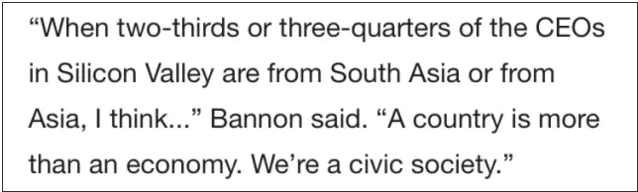 大家都在猜测他上位以后会这样对这“2/3到3/4”的亚裔CEO开刀。不过微信上听说此事的大部分吃瓜群众显然已经消化了 “他说的Asian是老印”。喂,你是Bannon肚子里的蛔虫吗?他说的明明是Asia,不是India。 “要是老印CEO能少点,我不在乎华人CEO少点”。这同归于尽的境界实在让人理解不能。 然而我却对他在这次谈话中的另一句话产生了浓厚的兴趣