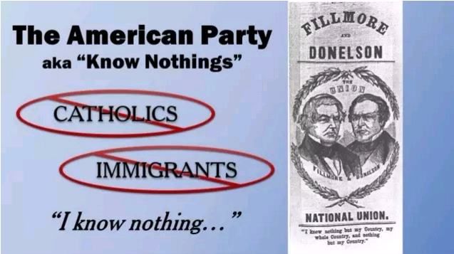 Know Nothing Party其实是1850年代美国著名的秘密政党,因党员对外部质询的标准答案是“I know nothing”而得名。该党主要由中下层白人男性清教徒组成,最重要的纲领之一就是反移民,因为担心移民抢走他们的工作。Know Nothing党曾一度控制麻省议会,并在1856的总统选举中获得90多万票。该党在1860年代逐渐失势,大部分都有加入共和党。
