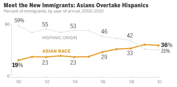 1)从移民的总数看,从2010 年开始,亚裔移民已经超过墨西哥人占到 36%。