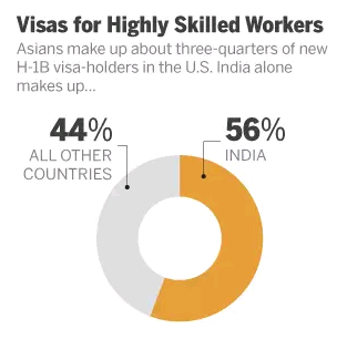 4)亚洲人拿走了75% 的H1B工作签证,其中印度人占了多一半。