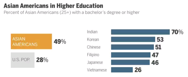 5)从教育程度上说,25岁以上有本科及以上学位的亚裔占到49%, 而美国整体水平只有28%,而印度人有本科以上学位的占到70%。