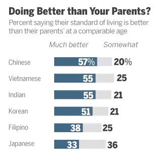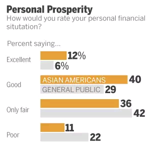 6)至于对自己目前经济状况和职业前景的满意度,跟美国大众比起来,亚裔自我感觉更好。