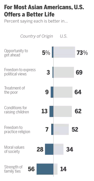 7)亚裔对美国的多个方面感到满意,但在道德价值观和家庭关系的紧密程度上,认为不如自己原来的国家。