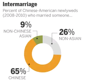 12)在结婚伴侣的选择上,65% 的华人还是选择了华人。9% 与其他亚洲人结婚,26% 的人与非亚裔结为伴侣。