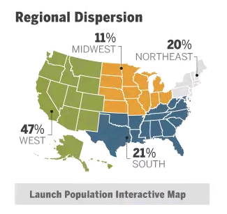 14)将近一半的中国人住在美国西部,东北和南部各有20%的华裔人口。