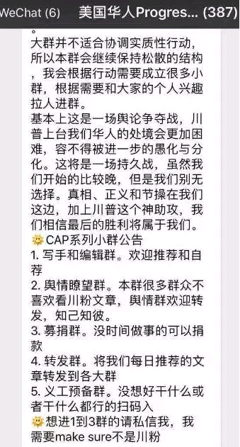 先看看一个名为“美国华人Progressive群”的通告,群主表示,“大群并不适合协调实质性行动,所以本群会继续保持松散的结构,我会根据行动需要成立很多小群,根据需要和大家的个人兴趣拉人入群”。她还说,“基本上这是一场舆论争夺战。。。虽然我们开始的比较晚,但是我们别无选择。真相、正义和节操在我们这边,加上川普这个神助攻,我们相信最后的胜利将属于我们”。她们还成立了CAP系列小群。什么写手和编辑群,什么舆情瞭望群,什么募捐群,什么转发群,什么义工预备群。更有趣的是,他们对入群采取了非常严格的审查措施。入群者需要加群主为好友,由群主审查入群者的好友圈,通过了才能放过。。。公告的前面还有这么一句话,“大选结果出来,很多人陷入shock,需要时间疗伤和整理思绪”。。。(川普神助攻的说法,我想大概是这样,因为川普是个大嘴巴,后面可能还是会有各种让咱们也觉得神奇的话出现,华左们正准备看笑话)