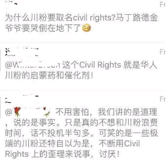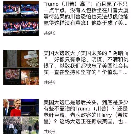 佯装川普支持者的好友圈 这些人,看来他们不能理解,得道多助,失道寡助。他们也不能理解,一个公众号,不过是一个工具罢了。关键的不是工具,是人,是道理。哪怕工具一时没了,满血复活也是轻而易举的事情。小编跟他们说,哪怕给咱一个空号,文章的阅读咱也可以给你弄上千上万,无它,咱们的实力就在那里。他们过去打败的,不是舆论战,而是道理战,是行动战。当然,咱不以胜败论英雄,对于有操守的人,无论什么立场,无论什么结果,咱都尊敬。