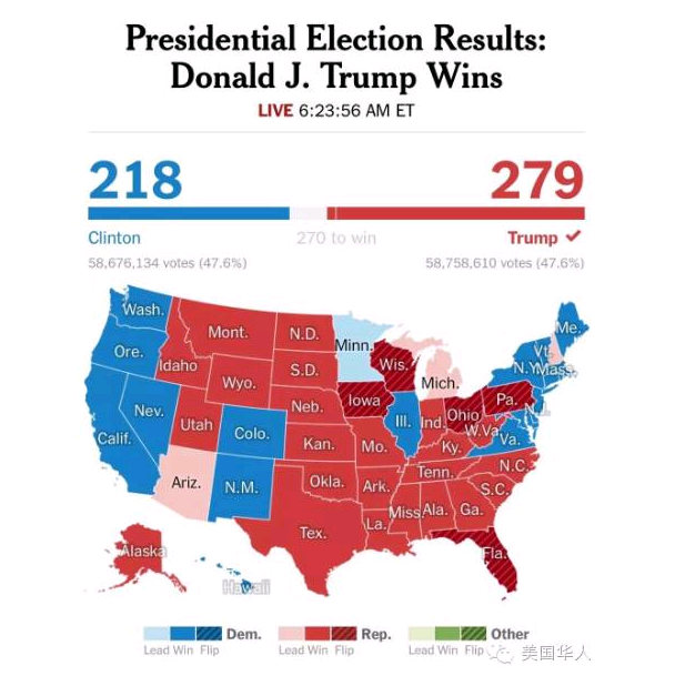 2016年11月8日,星期二,美国大选之夜,就像一个朋友的大选预测里说的那样,俄亥俄的结果一出来我就洗洗睡了。一觉醒来,美国已变天,纽约时报画的政治版图是下面这样的了。希拉里输掉佛罗里达是出乎我的意料的,但民主党更大的问题是五大湖工业区的沦陷。我当时在微信朋友圈里说大选最坏的结果不是你支持的候选人没有当选,而是一觉醒来不知道谁是新总统。并预测川普(又译作特朗普)当选引发的股市波动是暂时的,美国该怎么走还是怎么走!果然,当天股市不跌反涨,要知道,开盘前,三大指数的期货一度大跌5%以上。