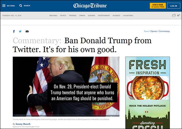 《芝加哥论坛报》此前同样建议推特,“为了自己好”,封禁特朗普