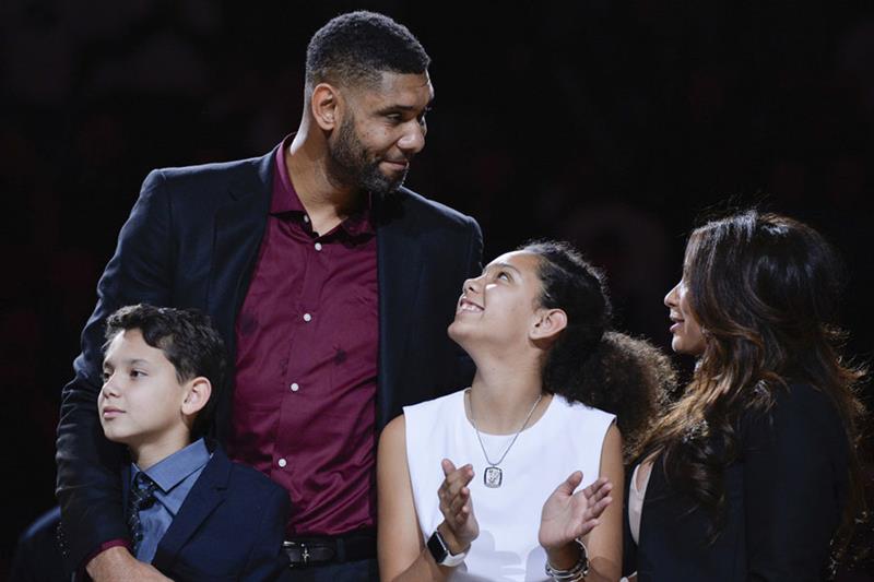 San Antonio Spurs legend Tim Duncan stands with his son Draven, left, daughter Sydney, and girlfriend Vanessa Macias, right, during his jersey retirement ceremony, Dec 18, 2016, in San Antonio.
