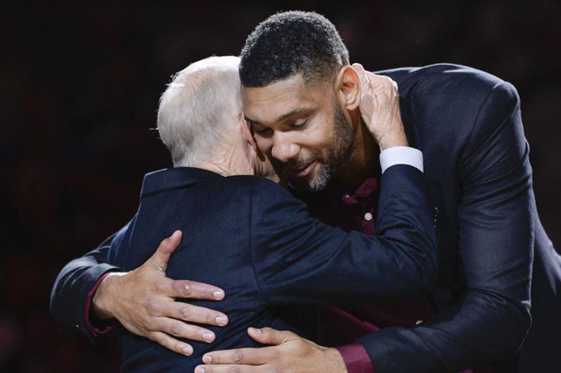 San Antonio Spurs legend Tim Duncan, right, hugs his college basketball coach, former Wake Forest head coach Dave Odom, during Duncan's jersey retirement ceremony on Dec 18, 2016, in San Antonio.