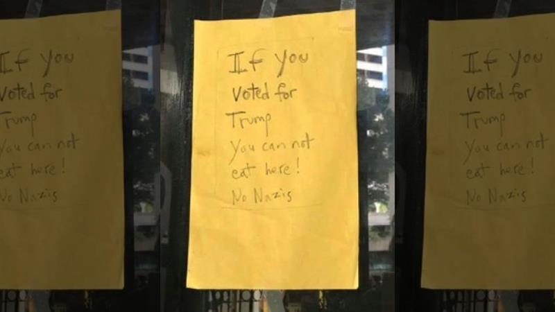 Honolulu’s Café 8 ½ gets rave reviews on Yelp for its “Radiatore Verde” and “Italian stir fry,” among other popular dishes at the eclectic mom-and-pop restaurant – but the response to its new 'policy' barring pro-Trump patrons has been decidedly more mixed. A bright yellow, handmade sign posted on the restaurant's front glass door declares: “If you voted for Trump you cannot eat here! No Nazis.” A photo of the sign was shared with FoxNews.com. One also is proudly posted on the café’s Facebook page, and was “liked” by some 40 people. “…The next time you're in Honolulu, eat lunch here, not only are they on the right side of things, the food is delicious and reasonable,” one Facebook user wrote next to the photo. Others aren’t so charmed. Honolulu resident and Donald Trump voter Susan Roberts told FoxNews.com she found the sign in “extreme poor taste.” “It's childish and very unprofessional,” she said in an email. “… The restaurant owner doesn't have to worry ... I will not be stepping foot in that establishment.” Willes Lee, former chairman of the Hawaii Republican Party and now president of National Federation of Republican Assemblies, told FoxNews.com the sign is discriminatory, and harkens back to “racist and hate-filled” days before statehood. “Remember when Filipinos couldn't go in certain places, or Japanese wouldn't be allowed [in] many homes? And, it didn't matter who they voted for,” said Lee, who is of Japanese descent. “People should be able to get food without hearing a political message,” one apparent former customer wrote on Yelp. “I will never go back.” According to the Honolulu Star-Advertiser, the café was founded by Robert Warner, a former hair stylist for Vidal Sassoon in San Francisco and former restaurateur in Seattle, along with his wife Jali. Reached for comment Tuesday, Jali downplayed the sign's supposed ban. She told FoxNews.com the restaurant is not actually asking customers whether they voted for President-elect Trump, and said even if they see a customer with a Trump shirt, “we don’t put anything different [in] your food.” “Robert just wants to express how much he doesn’t like Trump,” Jali said. “If people take it personally or it hurts them, we cannot help. That’s why we say they have [a] choice if they want to come or not come. We don’t force them.” She said three people called to complain about the sign when it first went up, “that’s it.” “We don’t want to create trouble,” Jali said. “There is enough trouble in the world.” While Jali is soft-spoken, Warner, some customers note, is known to channel the “soup Nazi” persona of New York City and “Seinfeld” fame -- “throwing pots and pans,” “telling off customers,” and “hanging not-so-friendly reminders on butcher paper for his customers to read.” But another Yelp reviewer took issue with the attitude and the sign, writing: “It was funny on Seinfeld, but this place can rot away. Stay away. Hawaii ain't like this. There's a lot of better places on the island than to have deal with extra crap like this.” Hawaii overwhelmingly supported Hillary Clinton during the Nov. 8 election, and historically has supported Democrats in local and national races. In fact, just six Republicans are in the 51-member House, and the 25-member Senate is GOP-free. Now that the election is over, however, Lee said most residents want to just get on with their lives. “The [restaurant] owners might want to make a better sign,” he said, “since Trump will undoubtedly be in office for eight years.”