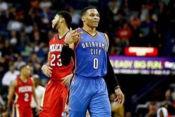 Oklahoma City Thunder guard Russell Westbrook (0) gestures after hitting a three point basket against the New Orleans Pelicans during the second half of a game at the Smoothie King Center. [Photo/Agencies]