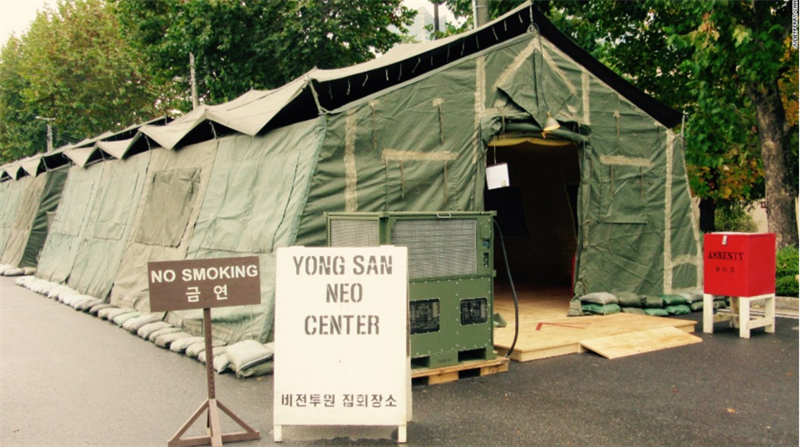'Daddy Doll''s face has a clear pocket where a photo of Dad can go. The 6-year-old takes a moment to rummage in her bag and produces her must-have item with a flourish -- a military issue doll given to the girls when Nick went on his first tour. "Daddy doll!" The girls are carrying their must-have items, but one lesson Nicholle says she's already learned from the exercise is to pack a little lighter. Although she's a strong fitness instructor, she's weighed down with over 150 pounds of luggage and it's slowing her down. STEP: REGISTER A string of tents is pitched at Yongsan Garrison military base. There's an icy wind and a trace of nervous anticipation in the air as families slowly gather. This is the first time since 2010 the evacuation simulation has gone all the way to Okinawa. Most people aren't really sure what to expect -- they've just been told, "it's not going to be comfortable."