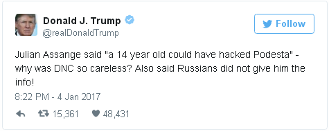 That was a reference to Trump's tweet on Wednesday noting that Assange said he didn't get hacked Democratic Party emails from the Russians, who have also denied the hacking allegations.