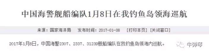 (一) 今年的春节来得格外早,今年的中国舰船也来得格外勤。 我指的是钓鱼岛。 中国海警船今年很早就来了,逡巡一番走人,日本人大舒一口气。但这口气还没松快下来,他们发现,中国海警船又来了…… 1月8日,中国国家海洋局网站,又发布了一条一句话的消息: 2017年1月8日,中国海警2307、2337、31239舰船编队在我钓鱼岛领海内巡航。