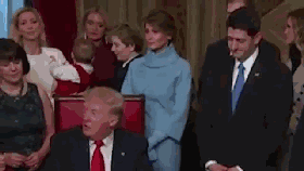11:05分,川普抵达国会山,就职仪式也即将开始 11:30分,人群已经落座,就职委员会主席,参议员布伦特(Roy Blunt)宣布典礼开始! 川普走进会场,很多媒体都在解读川普进入会场那一刻的表情,其实笔者看到的就是一个面容严肃的川普(看下图),他向人群挥手,高举拇指,嘴中说着 HELLO ! 并与奥巴马和拜登握手。