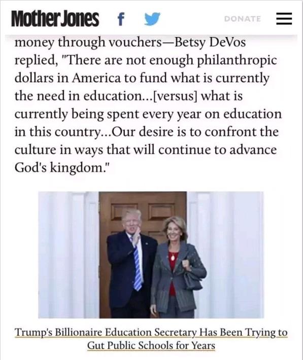 谁是Betsy Devos? Betsy Devos是传销品牌安利创始人Richard Devos的儿媳妇,亿万富翁,前密歇根州共和党主席,大金主,说客(lobbyist),听证会上桑德斯询问她“听说你的家族在过去为共和党共捐过2亿美?”她没有否认。 说起来她并不是一直支持川普的,共和党初选时曾先后支持过Carly Fiorina,Jeb Bush和Marco Rubio,是传统建制派政客。 她从未在任何公校和私校任教或任职,她和子女也从未上过一天公立学校。尽管自称教育改革家,她在底特律搞的教育改革实验结果却一塌糊涂。 反吃瓜补充:除了k-12,教育部长还要负责整个学生贷款项目,涉及资金上万亿美元,然而在听证会上Betsy Devos自己说她连百万美元的贷款项目都没有负责过,同时她和她的子女也没有参与学生贷款的申请,我们真的能放心把那么多资金交给一个毫无经验的人吗? Devos的主要政策核心 学券制(Voucher):选择不读公校的学生可以拿政府补贴就读私校。 基督教:除了扶植教会学校,Devos一直提倡公立学校需要加强基督教价值观教育。 学券制是个什么鬼? 美国的K-12公立教育是免费的,经费来自学区居民的房产税。基本上有钱人居住、房价高的学区房产税高,学校经费充足,学校质量高;好学区会吸引更多重视教育的家庭买房,进一步推高房价。差的区就反过来,房价和教学质量都比较低。
