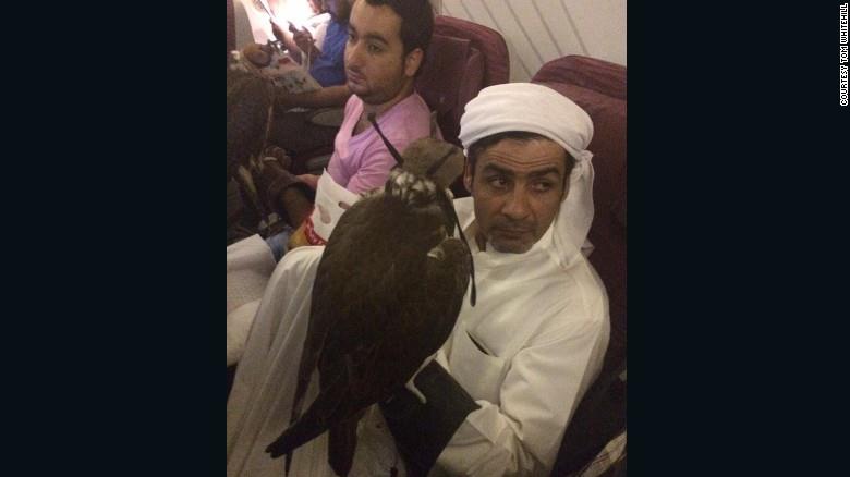 Qatar, Etihad, Emirates and Royal Jordanian Airlines allow falcons in their cabin area. In 2014, Tom Whitehill took a Qatar Airways flight from Dubai to Doha and experienced traveling with the falcons first-hand. "It was quite strange, there was no warning that they were going to be on the flight," he told CNN. "I had heard plenty of stories of falcons flying throughout the Gulf in the cabin of the aircraft, but had not seen it before -- it was a nice surprise, but definitely a bit surreal." Whitehill said the birds weren't noisy, and barely caused a fuss -- except for when the plane came into landing. "They had hoods on, so they were quite calm and relaxed until we started to land and they started to flap their wings," he said. Cultural expert, Kayed, said owners usually covered the birds' eyes to keep them "at peace" -- "because when they see (something) they have to go and get it." So, which airline can you take your falcon on?