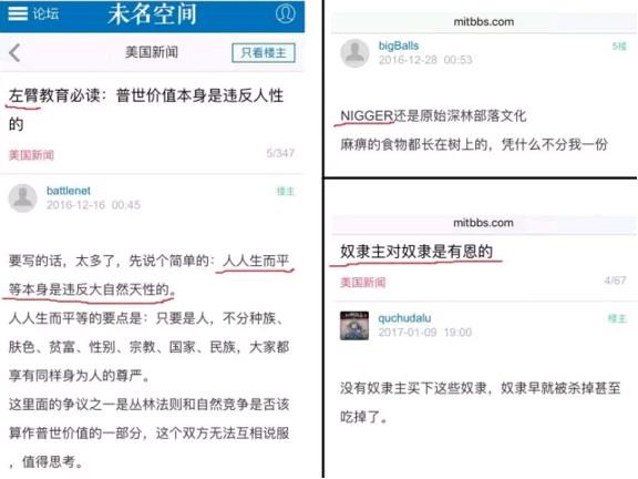 挺川问题的严重性 在这次大选当中,从去年年初至今约一年的时间里,我在各大中文网络媒介上,亲眼见证了华人挺川运动的声势浩大,也大量耳闻目睹了华人川普支持者(以下简称“川粉”)的行为和言论,并与大量川粉有过多次深入交流和激烈辩论。许多挺川运动的情况,与一些川粉对外宣称的完全相反。许多奇事,则见所未见,闻所未闻。如果你是川粉之一,读完这篇报告以后,不认同我所叙述的川粉奇人奇事并为之感到羞耻,那你应该怪罪那些给华人挺川运动抹黑的不肖之徒,而不是责备我把所见所闻如实写出来。川普当选之后,冒天下之大不韪与台湾领导人通电话,大陆移民社区舆论哗然,许多川粉开始纠结自己的选择,有些甚至公开倒戈。而川普就职以后,大刀阔斧急剧右转的反移民改革已有开始之势,华人社区议论纷纷,忧远多于喜。近日川普签署行政命令,打着国家安全的幌子,造成来自某些国家的合法入境人士包括绿卡持有者无端被拒绝入境。为此,许多华人忧心忡忡,担心若将来美中交恶,类似的可怕遭遇也会发生在自己身上。至此,曾经的挺川华人应该怎样对待川普?是继续崇拜歌颂他吗?是转而监督甚至批评抗议他吗?还是自此销声匿迹,不再关心政治?每个美国华人对于这三项都有选择的自由,不过时局将强迫你迅速地选择罢了。 组织起来 在第一代来自中国大陆的华人移民中,支持川普的人毫无疑问占了主流。虽然没有针对这一人群的投票或调查资料,但据估计川粉占到此人群的80%以上。各地华人川粉都组织了起来,不仅踊跃捐款给川普,还集资用飞机拉 "Chinese Americans for Trump" 的横幅,还在高速公路旁边租了同样内容的大型广告牌。各地川粉还前往宾州,俄亥俄等战场州,扫街拜票。 除了实际行动,华人川粉在舆论上也大展威风。虽然川粉经常自称“沉默的大多数”,但他们在中文网络媒介不仅不沉默,而且可以说是聒噪和歇斯底里。不仅各地都有大规模的挺川微信群,从前的其他微信群,包括声援梁彼得群,新闻议政群,校友会同乡会群,甚至各种生活兴趣爱好群,有许多都被川粉占领,大量发布支持川普的文章和新闻链接,经常造成群里正常的讨论话题被挤压殆尽,代之以吹捧川普同时辱骂民主党和建制派的言论。群里原有的不支持川普的人,则动辄被围攻辱骂。如果群主是川粉,情况则更加不堪,群主因政治立场不同把人踢走或者鼓动纵容川粉辱骂不同政见者直至其不堪忍受而退群的现象屡见不鲜。被波及的非政治的微信群,就像文革时期的一个个中国城镇,一旦造反派被鼓动起来,无论民房商店还是工厂学校,满墙都铺天盖地贴满了大字报和文革标语,就连街头的大喇叭里,也是女红卫兵广播员在充满革命激情地高呼“革命无罪,造反有理”。 除微信外,川粉在传统中文论坛上也势不可挡。老牌中文论坛MITBBS上的“美国新闻”板块,成了如假包换的极端川粉集散地。这个版面有相当长的议政历史,其网友多为极右华人,2008年和2012年两次大选都支持共和党候选人。此版的特色是随处可见的种族主义言论和下流淫秽语言,用生殖器词汇辱骂网友的,崇拜纳粹的,鼓吹种族清洗的,宣传白人至上的,发表针对黑人,墨西哥人和其他非白人的种族歧视言论的,应有尽有,屡见不鲜。挺川运动当中,此类网友更是异常活跃,对川普的肉麻吹捧随处可见。现任版主据传异常自恨,曾经为美国政府诬陷华人科技工作者为“间谍”大肆叫好。大选期间,版主一如既往纵容丑恶言论,对支持川普的网友肆意辱骂他人不闻不问,反而对反对川普的网友不那么激烈的言论动辄删帖和封禁。在攻击和打压反川网友的同时,挺川网友之间也展开了毫不留情的内部清洗。一个自称先后给川普捐款两千多美元的网友,因为琐事被其他川粉围攻,被指对川普不忠诚。还有一个活跃多年的老网友,他的儿子患有一种罕见病,多年来受了很多苦,他这次大选也支持川普。但当川普当选以后,他看到川普的所作所为,表示后悔了自己的选择,因此被其他川粉侮辱谩骂诅咒,甚至他儿子的病情也成了骂人者的素材。对于此类毫无道德底线的言论,版主当然大加纵容。由于版主“治版有方”,该版成了最极端最激进的华人川粉最理想最舒适的网上精神家园。