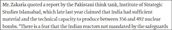 扎卡里亚说,印度一直在试射洲际弹道导弹,“在常规武器平衡已经受到干扰的情况下,印度的核武器建造达到危险的比例,这破坏了战略平衡,也危及该地区和其他地区的和平。” 观察者网军事评论员认为,自印度1998年核试验后,印巴两国都陆续拥有了导弹核武器。不过,两国实际核技术和工业化水平还是比较落后的。目前尚未有任何迹象表明印度和巴基斯坦接近于研制成功热核武器,两国拥有的核武器技术水平最高评估也就是增强型原子弹。另外,见诸报端的也不乏两国以国际原子能机构的标准与原则来指责对方破坏战略平衡,但这样的指责很大程度上是一种宣传战。
