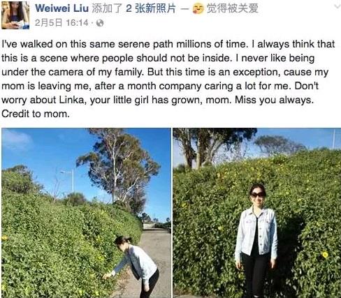就在出事前一周,刘薇薇在脸书上还贴文感谢母亲抵美陪伴,却在一周后突传噩耗。(取材自刘薇薇脸书)