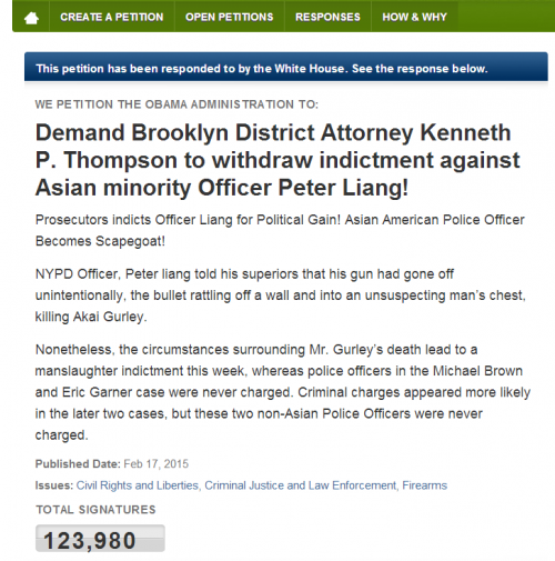 据环球网报道,纽约华裔警察梁彼得被定罪后引起全美华人的不满与愤怒,为了声援梁彼得,在美华人在白宫请愿网站上发表请愿书,要求检察官撤销对梁彼得的起诉。至请愿结束,请愿书上已经有近12.4万民众签字。白宫做出了回应。