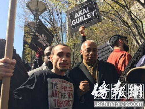 州众议员巴伦(右)到场助威葛雷方抗议。(侨报记者高诗云摄)