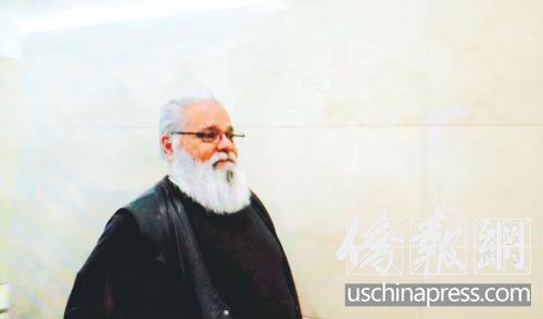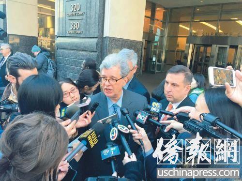 梁彼得律师舍曼庭外接受采访。侨报记者高诗云摄