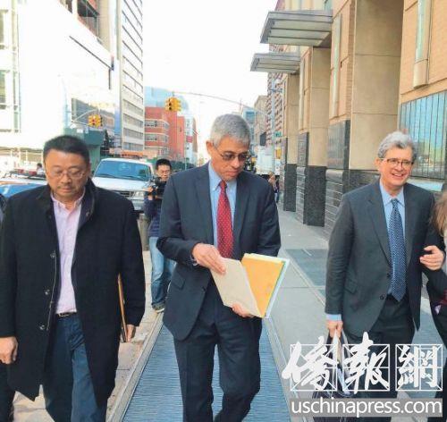 梁彼得律师陈盖博(中)、舍曼(右)及亚裔维权大联盟总召集人陈善莊(左)一同离开法庭。侨报记者崔国萁摄