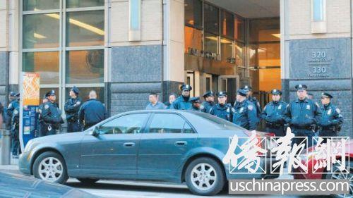 ▲为了以防不测, 警方13日派出大量警力驻守在法庭外。 侨报记者崔国萁摄