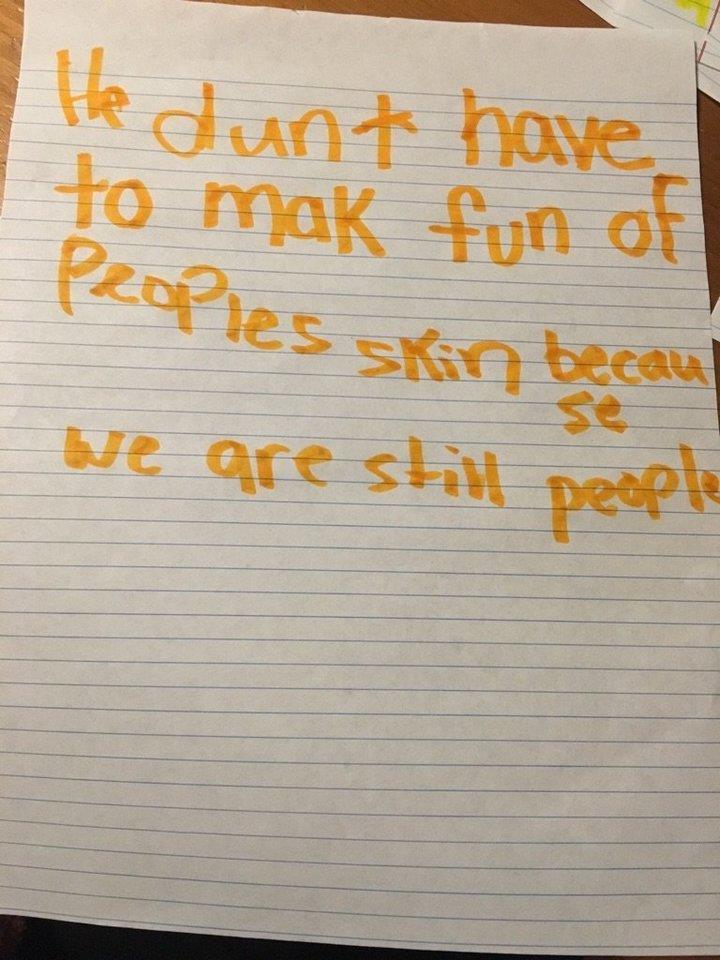 Anonymous An elementary school student in Austin, Texas, submits a writing prompt after a series of immigration arrests in February 2017. “It’s an issue that’s bigger than just the students,” Garibay told HuffPost. “We have DACA-mented teachers that are really worried about their jobs,” he said, referring to the work permit program. In theory, schools should not become a focal point of deportation fears. A 2011 policy restricts ICE from arresting people at sensitive places, including churches, funerals and schools. ICE’s brazen actions over the last weeks, however, leave some wondering whether the agency continues to follow it. “To my knowledge, [ICE agents] haven’t entered a school,” Barbara Hines, the former head of the University of Texas at Austin Immigration Law Clinic, said at a conference last week. “But parking next to a school is the same thing.” Students are still concerned, the first teacher said. As ICE swept through Austin, rounding up 51 people in the area, she was teaching lessons about Martin Luther King, Jr. and the civil rights movement for Black History Month, which began Feb. 1. When her students learn about the subject, they see parallels to their own lives, she said. They feel targeted for their brown skin like African-Americans are targeted for being black. “They’ve asked questions like, ‘Why us?’” the teacher, who gave her elementary class the drawing assignment, told HuffPost. “And there’s a lot of talk of Donald Trump. Like, ‘Is he the one doing this? Why does he hate us?’” Since politics are off limits, she answers in the most neutral way she can. “I tell them that just because a person is a leader doesn’t mean that they’re right,” she said. “It’s up to us to make sure that we tell other people so that they know it’s also not right. I tell them even though you think you’re little, it doesn’t mean you can’t teach others.”