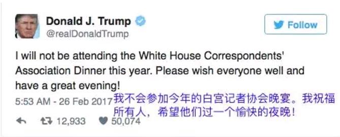奥巴马在白宫记者晚宴上演讲 以前的总统们,就算心里对这些记者有再多的不满,也还是笑脸相迎,以免惹来更多的麻烦。特朗普却根本就不吃这一套,直接公开和各种媒体进行互怼,将记者们得罪了一个遍。 特朗普为何一反传统,敢和记者撕逼?这可就说来话长了。 2017年2月25日,一向被戏称为“推特治国”的美国总统特朗普,发了一条引人注目的推特状态:“我不会参加今年的白宫记者协会晚宴。我祝福所有人,希望他们度过一个愉快的夜晚!”