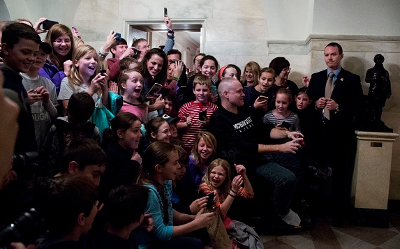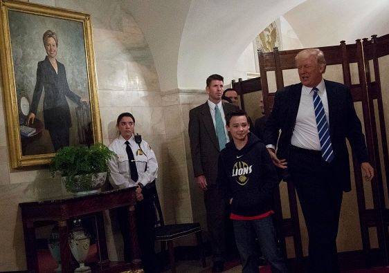 白宫周二(3月7日)迎来数百名参观民众,这是川普(特朗普)总统上任后白宫首次开放。大约一百名参观的民众,都体验了一个大惊喜。 NBC报导,7日参观白宫的民众中,大约一百名走到东翼时,川普意外地现身,一时惊呼连连,参观者隔着一条天鹅绒绳子向川普挥手致意。 川普向人群中的10岁男孩杰克.康沃尔(Jack Cornish)招手,康沃尔走到川普身旁,川普弯腰和他寒喧,此时参观人群兴奋地欢呼并拍照。