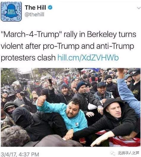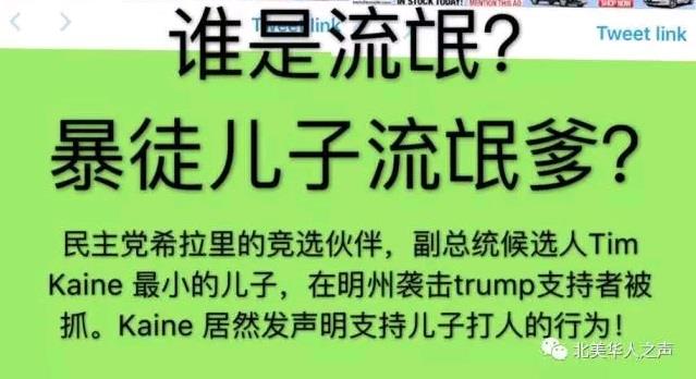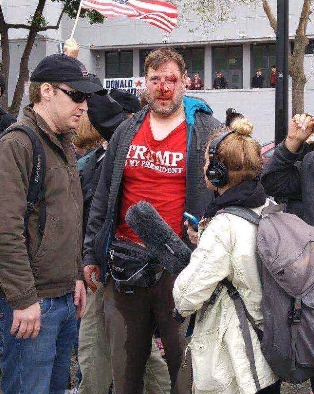 差点成了副总统的Kaine先生和老婆周二晚上发表声明,表示,对于他们的三个娃面对当前的政治话题有自己的见解和关心,他们非常喜爱。他们还说,我的娃们非常理解和平表达关心的责任。("We love that our three children have their own views and concerns about current political issues. They fully understand the responsibility to express those concerns peacefully.") WOW,儿子用暴力对待和平游行的异议者,这个差点成了副总统的人,居然丝毫不介意,甚至还鼓励!难怪川普会当选! 不过,请大家放心,周二(3月7日)的时候,这娃已经被Ramsey的监狱给释放出来了,虽然进一步的调查还在继续。据悉,目前还没有对他和另外4个一起被以二级骚乱嫌疑逮捕的同伴进行起诉。另一位被抓的只是被认为不正当骚乱。 好吧,大家再看两张照片,看反川义士是怎么残忍对待异议分子的(即挺川人士):