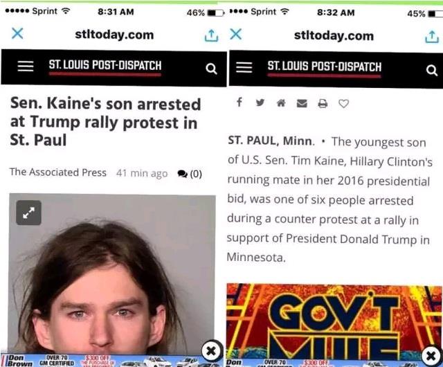 还记得我们曾经和大家分享的March 4 Trump相册么?有反川义士居然责问,怎么不发打架的照片,心虚了么?想一想,川普支持者游行,只要其他人给予尊重,不干涉他们的合法行动,怎么打架? 唯一的可能,那便是反川义士们奋勇进攻,导致战事纷起,秩序混乱。这样一分析,咱们哪来的心虚?不过是没时间面面俱到罢了。 今天大新闻果然出来,反川义士不负众望。希拉里前副手,副总统候选人Tim Kaine 24岁的儿子Linwood Michael Kaine 来帮咱们说话了。原来,果然,是他们,主动破坏秩序,干扰川普支持者的游行,并为此锒铛入狱! 他的起事地点在明尼苏达的首府。当时,面对和川普的支持者,他们发生了小冲突,而这个娃呢,居然伙同另外5个人朝着反对者点燃烟花。令人失望的是,他们居然事后立即逃窜。不过这娃还挺有种,面对跟踪而来的警察,没有束手就擒,而是反抗了一下,让警察们不得不稍微动用了一下武力制服。