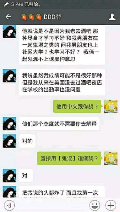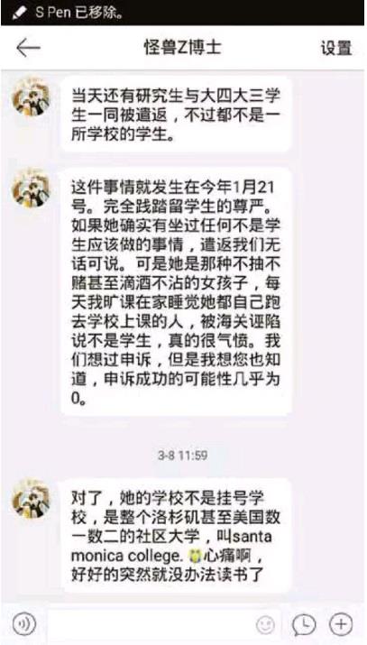 D同学男友Z同学表示,他女友无旷课记录。(微信聊天记录截图) 网友Z同学8日在微博向记者留言表示,他的女朋友D于今年1月21日在海关遭遣返,并要求5年之内不得入境。Z说,他和女朋友在圣塔莫尼卡学院上学。但是海关质疑她的学生身份,一口咬定她不是学生。Z同学表示,他女友出勤率和成绩完全达标,但是海关不信。Z说,「海关审讯了12个小时,期间一直处于逼供状态,强行让她承认,她当时已经处于崩溃边缘了,几个移民局的人一直轮流逼供吼叫。拿走她的手机电脑都查了,没有查出来任何东西,就一直威胁她会坐牢。」 学生喊冤校方出面仍无作用 记者10日联络到Z的女友D,D表示当时她只是录了指纹之后就被带入「小黑屋」,一名华裔海关关员一直逼她承认不是学生,并说「你是不是总和男朋友去酒吧那种场合鬼混,才学习不好的?」此后,她的男朋友联络了学校主任,主任主动打电话向海关证实她的学生身份,但是海关仍然不买账,转而指责她的成绩不够好。D说,她成绩虽然一般,但是马上就可以正常选课的水平。 Z同学还表示,当天被遣返的不只他女友一人,还有研究生、及大三大四的学生,不过都不是同一所学校的。此前,高姓女留学生,因非法工作而被遣返,虽然海关工作人员曾向高同学表示,微商不算非法工作,她被遣返是由于非法为中介公司工作。移民律师表示,微商也属于留学生非法打工。根据移民局法规,留学生只能申请校内打工,且每周不能超20小时。除此之外,有薪酬的工作都算是非法打工。 移民律师表示,海关不需要直接证据,就可以遣返入境人士。他建议学生不要在非假期离境,如果不得不离境也应请学校出示一份证明,以备海关查问,此外学生也应该著学生装备,如浓妆艳抹或穿的太过招摇,也不符合学生身份。 虽然很多挂靠学校在法律上得到许可,但海关仍然会盯住这些学校严查,所以短期求学的学生,建议不要轻易离境。