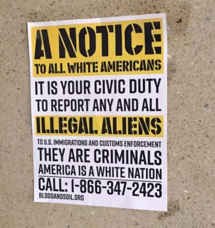 马大校园第二次出现仇恨海报。(Dimondback校报) 马里兰大学校报Dimondback报导,多张由白人至上组织张贴的海报13日出现在总校区College Park的校园。在"给所有白人的告示"(A Notice to All White Americans)海报中指出,"举报非法移民是你做为一个美国公民的义务",同时也告诉美国移民与海关执行署(ICE),非法移民是罪犯,"美国是个白人国家"(America is a white nation)。 该海报底下署名Bloodandsoil.org,是极端白人主义组织Vanguard America的官方网站。 马大校警据报后调查,在化学系和工程系共四个地方发现这海报。这不是第一次马大校园发现具有种族仇恨意味的海报,去年12月校警也在Lee Building、Tydings Hall、LeFrak Hall和Marie Mount Hall发现类似海报。 马里兰大学是马州州立旗舰大学,学生族裔多元,校长陆道逵也是第一代华裔移民。这仇恨海报最先由化学系教授古提耶兹(Osvaldo Gutierrez)和太太发现,古提耶兹是墨西哥移民。 警方已经朝仇恨犯罪方向调查此案,去年12月类似仇恨案,尚未侦破。