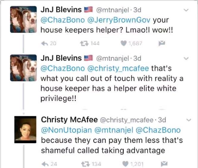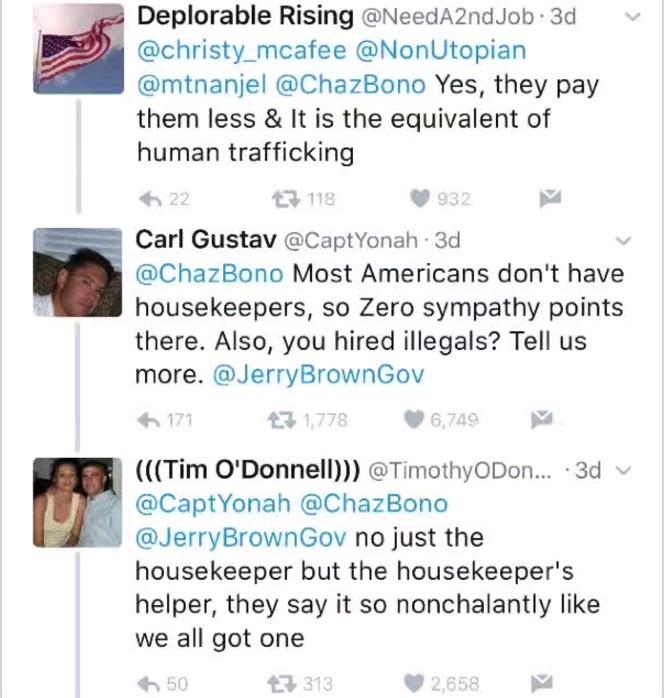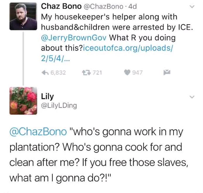 “多么熟悉的声音,陪我多少年风和雨,从来不需要想起,永远也不会忘记!” 看到Cher的儿子Chaz Bono的推特,心中不由得响起了这首歌,没忍住就给他回了一推,估计看得懂的还不是太多。 Chaz住在加州,他跟州长布朗诉苦说,我的仆人的助手和她的老公孩子都被联邦移民局缉捕了,州长大人你看怎么办吧? 他这个帖子出来说风凉话的人近七千,同情的人居然不多!有人说,你的仆人的助手啊,太牛了!还有人说,他们是非法移民啊,你咋不聘用合法的呢?来!再多给我讲讲怎么回事?! 给大家感受一下吃瓜群众的反响。