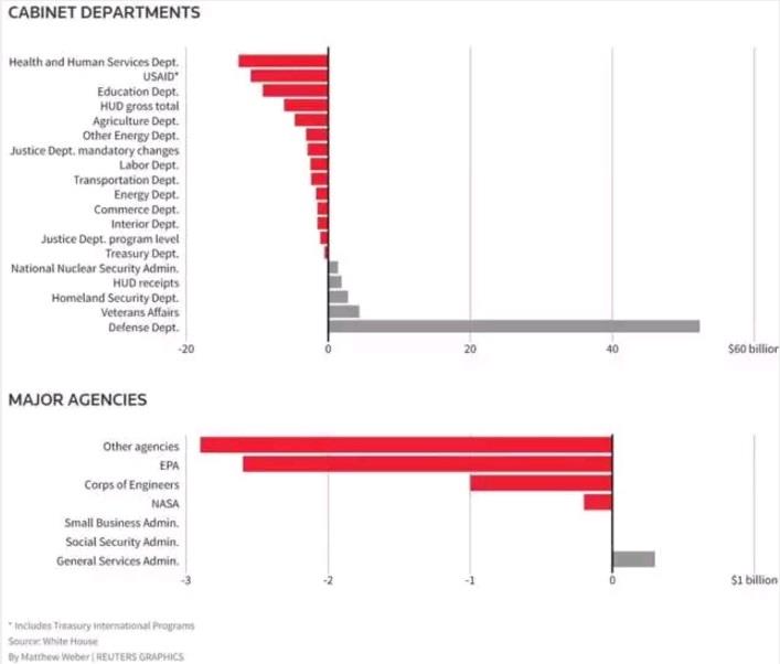 ►特朗普公布的2018年预算图表,红色表示预算减少的比例,灰色表示预算增加的比例
