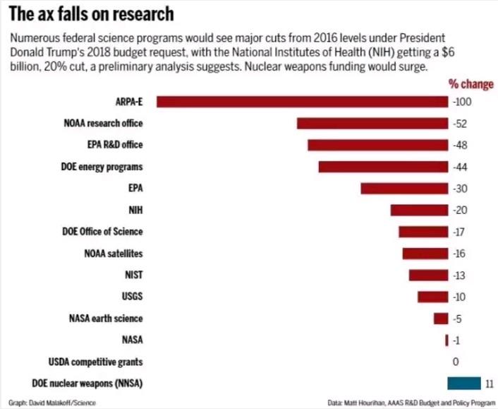 (漫画作者:田召) 撰文 | 叶水送 3月16日,美国总统唐纳德·特朗普公布了2018年度预算蓝图:“美国优先:让美国再次伟大的预算蓝图”(America First: A Budget Blueprint to Make America Great Again)。预算计划一公布,美国科学界一片哀嚎。 在国防、国土安全部以及核安全管理局等部门,预算中有大幅提高,而以卫生与公共服务部、环境保护署、农业部为代表的部门,预算将分别被砍掉19%、31%以及21%。Nature、Science等主要学术期刊第一时间对该事件予以高度关注,以《华盛顿邮报》(the Washington Post)、美国国家公共电台(NPR)等为主的大众媒体,也对该事件进行了详细的报道。
