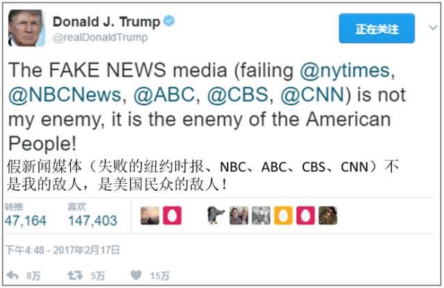 △ 特朗普发推文攻击主流媒体 即使有时候他发的推特并不像一位总统会说的话,但如果每个人都在攻击他,错误地表达一些事情也会让人感到沮丧。他没有政治背景,也因此并不知道该如何处理一些事情。但是作为一个人来说,他使用的是正确的方法,因为如果所有人都在不尊重现实地攻击我质疑我,我很可能也会做出同样的举动。 而且我认为在当今的环境下,我们需要这样的直接的人。在过去,我们只追求政治正确,每个人都害怕袒露自己的观点,如果我们能够接受坦然地接受所有的观点,无论是对的还是错的,这就是你的感触。每个人都在学习如何接受别人的观点,这也正是他做的事情。如果我们都在传颂要接受别人的观点,那么我们也应该接受特朗普。 对特朗普政府的展望 我相信他对美国的所有预想都是为了实现美国的最大利益。他所做的一切也是为了保护美国,也许这看上去太严厉,非常直接,也令人感到害怕,但我觉得他真正地控制了所有事情。因为现在很多事情都是一团糟,他只是先将其摧毁,做一些极端的决定。但是从长期来看,这些决定并不会如此极端,他只是先修正所有的事情,再让我们过度到一个平稳、顺利的未来。