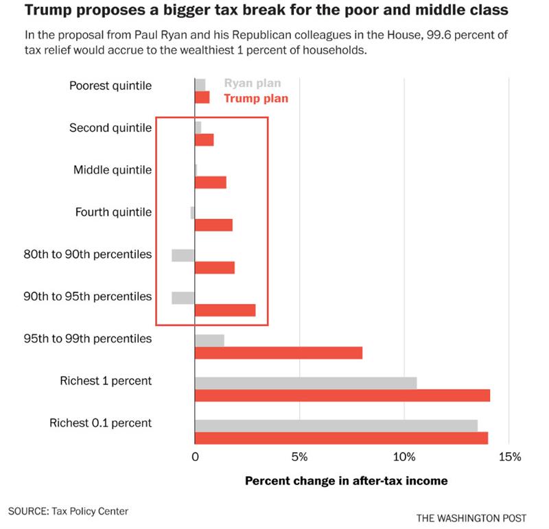 在医保法案惨败后,据华盛顿邮报报道,特朗普和众议院议长Paul Ryan都想要重修税法,但对于中产阶级该减税多少,他们产生了严重的分歧。 华盛顿邮报称,根据特朗普在竞选期间公布的计划,特朗普希望全面减税,提出了对富人减税,也对不那么富裕的家庭减税。而Ryan和众议院共和党人提出的税改计划则不会显著地削减中产阶级的税收,很多家庭反而要交更多的税。 如下图所示,特朗普希望大幅减税,尤其是针对富人,当然也针对穷人和工人阶层。Ryan的税改计划同样对富人很慷慨,而给予穷人及中产阶级的税收减免就没那么多了,甚至会增加一些中上层阶级的税收。而对于最富的0.1%的家庭来说,特朗普和瑞安的减税效果相差无几:在Ryan的计划下,每个最富家庭每年平均减税140万美元,特朗普计划下则为150万美元。 据美国税收政策中心(Tax Policy Center)统计分析,十年之后,Ryan提出的税收减免有99.6%将会累积给美国最富的1%的家庭。相比之下,在特朗普税改计划之下,有50.8%的减税会流向这一富裕群体。