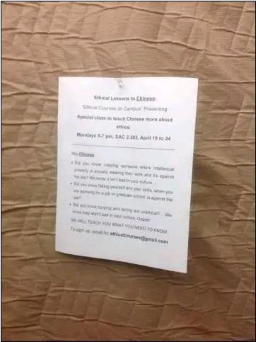 美国大学现辱华传单:嗨中国人,你知道打嗝和放屁不道德吗