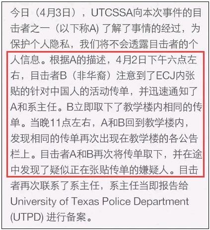 UTCSSA表示,已向两名目击者了解了事情经过。2日下午,传单被发现并被取下,当晚11点,传单却再次出现在教学楼的各公告栏上,目击者也发现了疑似正在张贴传单的嫌疑人。