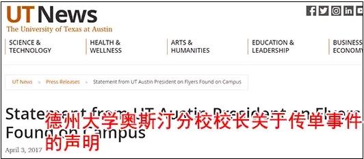 传单题头写着“给中国学生上一堂道德伦理课”(Ethical Lessons to Chinese),请华人学生每周一参加他们“专门为华人学生开设的道德伦理”(Special class to teach Chinese more about ethics)。 正文则嘲笑中国学生打嗝、放屁,并影射中国学生在学术上抄袭,在学历、求职中造假等。文末还附上一串电子邮箱,要中国学生每周一都去参加他们举办的「道德伦理座谈会」。充满歧视及争议性的内容,已经引起中国学生极度不满,纷纷要求校方出面处理。 这份传单透过社交网站,快速在中国留学生之间传播,也引起轩然大波。许多中国学生都表示无法接受,也在微信上自主发起活动,要求有人为该事件负责。 已经有UT学生表示,将会追究到底,