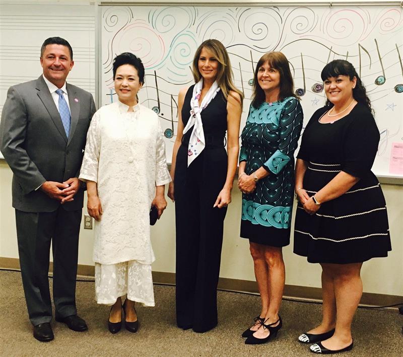 在中国两国元首进行会晤的同时,美国第一夫人梅拉尼娅陪同中国第一夫人彭丽媛访问西棕榈滩市的贝克艺术中学(Bak Middle School of the Arts)。